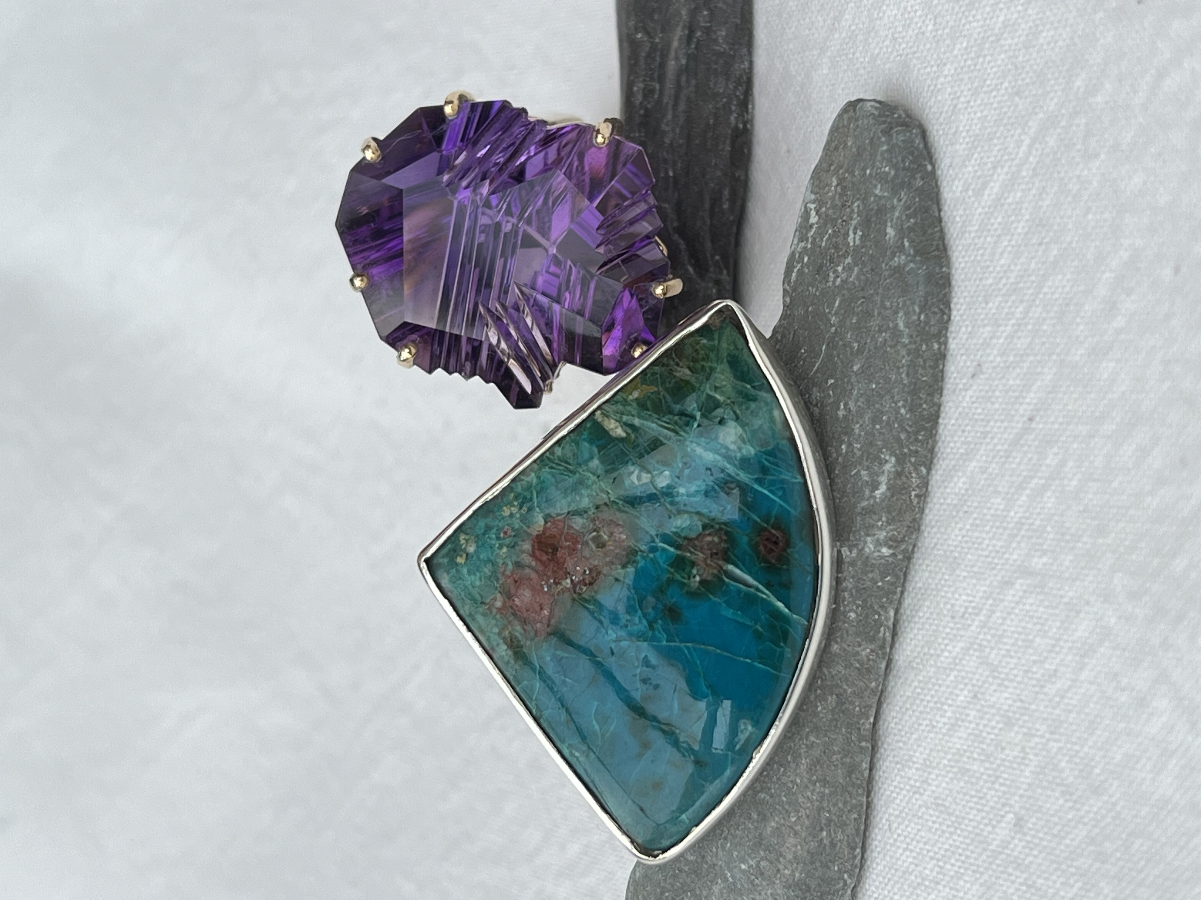 Andy is a local silversmith specialising in statement rings, using semi-precious stones, glass and recycled materials such as Fordite and Surfite. He loves working in silver, and he had tried to capture the magic of molten silver in some of his pieces. He is particularly moved by the colours in the semi precious stones, and loves how the silver enhances the stones.